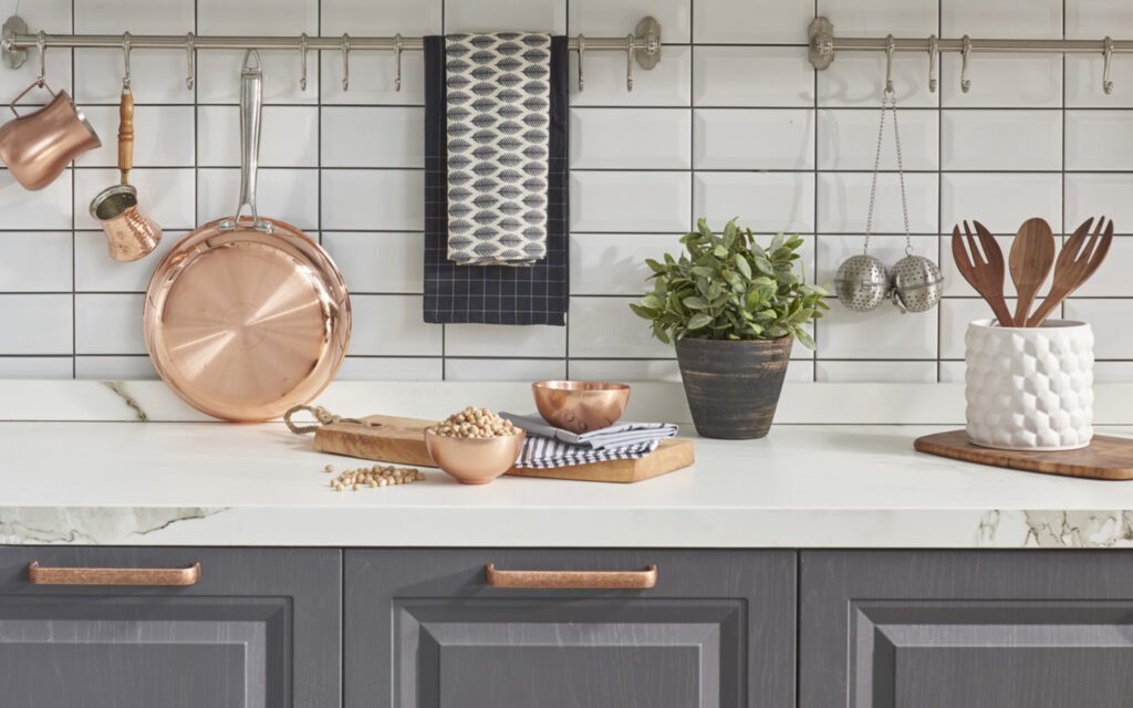 عند اختيار خامات الأسطح (كونترتوب)، الأرضيات، وأبواب الخزائن، احرصي على اختيار مواد متينة وسهلة التنظيف — لأن المطبخ مكان يتعرض للرطوبة، البقع، الاستخدام اليومي.